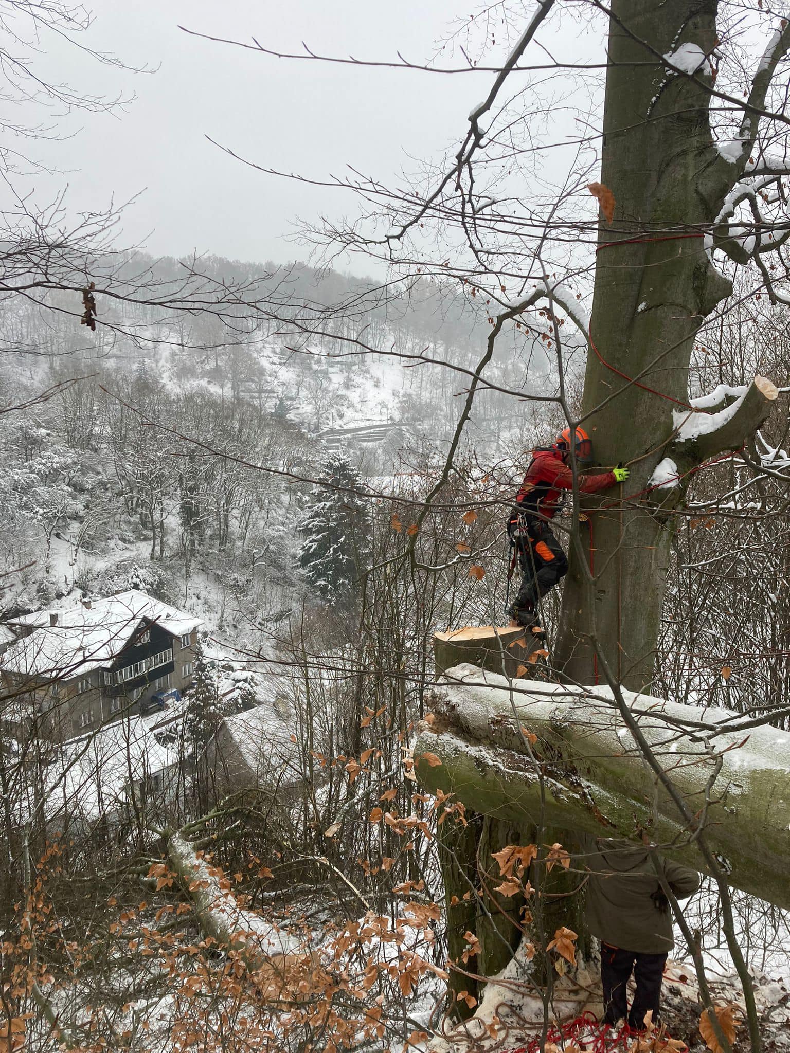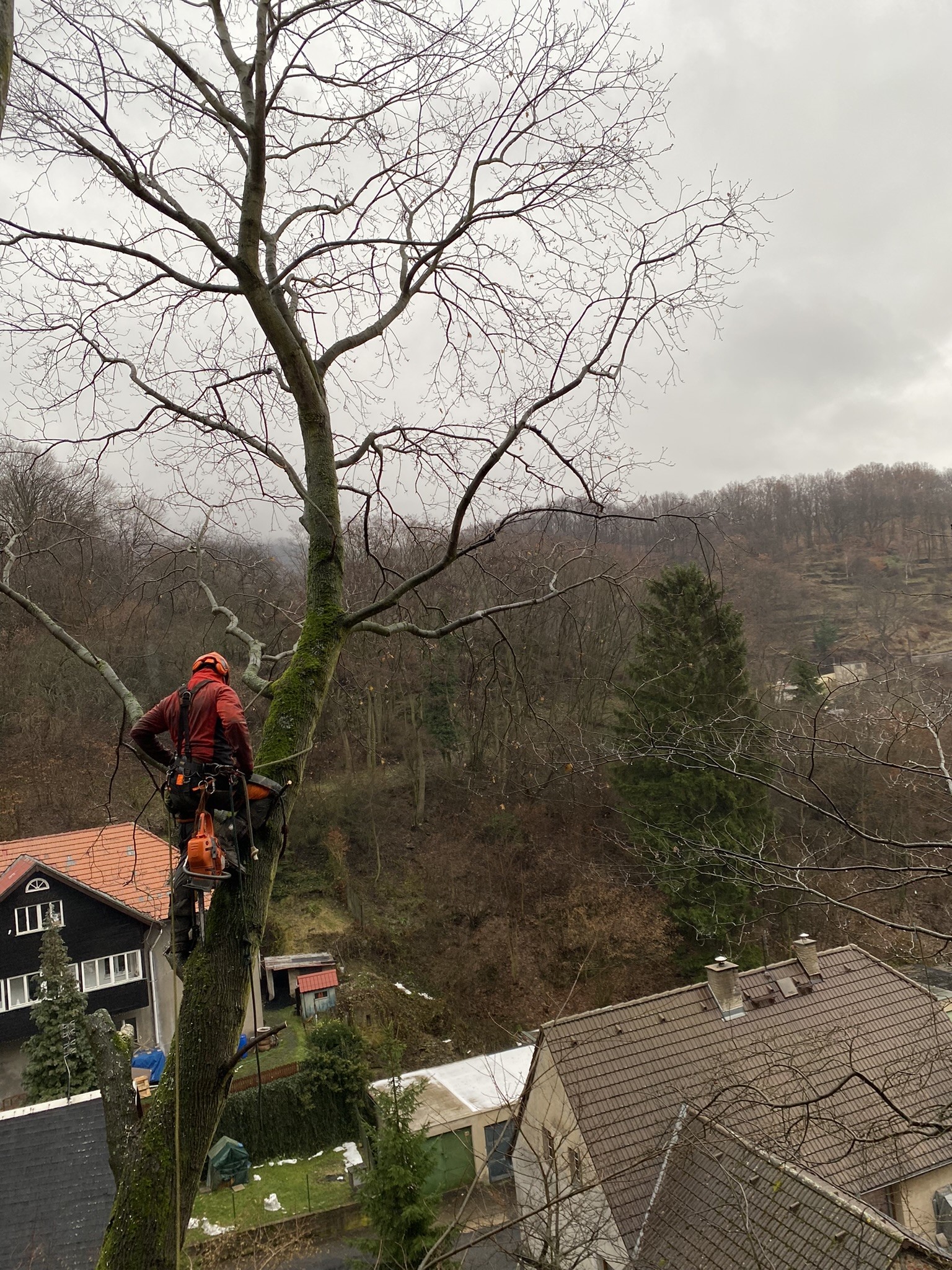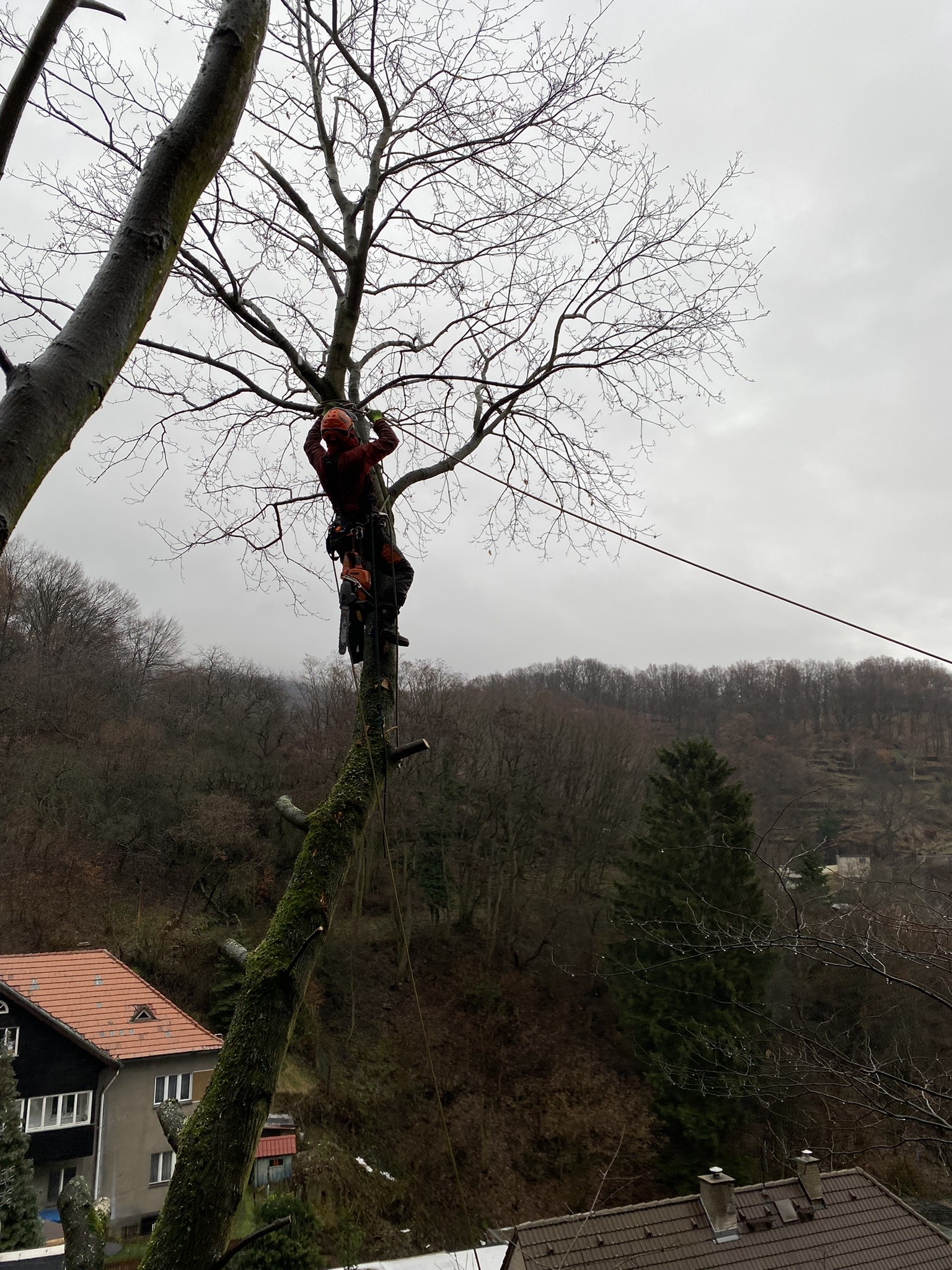 V případech, kdy nelze strom pokácet klasickým způsobem rovnou na zem volíme meotud kácení po částech, které je často označováno právě jako rizikové kácení stromů. Stromolezec nainstaluje pomocí stromolezeckých metod lano, aby se mohl bezpečně pohybovat ve výškách se zavěšenou motorovou pilou a dalšími pomůcky na pokácení stromu. Stromolezec poté postupuje od vršku směrem dolů a postupně kácí jednotlivé části stromu. V případě, že se pod stromem nachází dostatečné množství prostoru, může odřezané větve a části stromů volně házet na zem. V opačném případě, kdy se pod káceným stromem nechází překážka, kterou je potřeba ochránit před káceným stromem je třeba použít speciálních technik. V těchto případech kácení používáme lana, kladky a speciální mechanismy pro bezpečné spouštění odřezaných větví a částí stromů. V obou případech postupně odřezáváme části stromu, až nám zbyde kus, který lze bezpečně pokácet přímo na zem.
